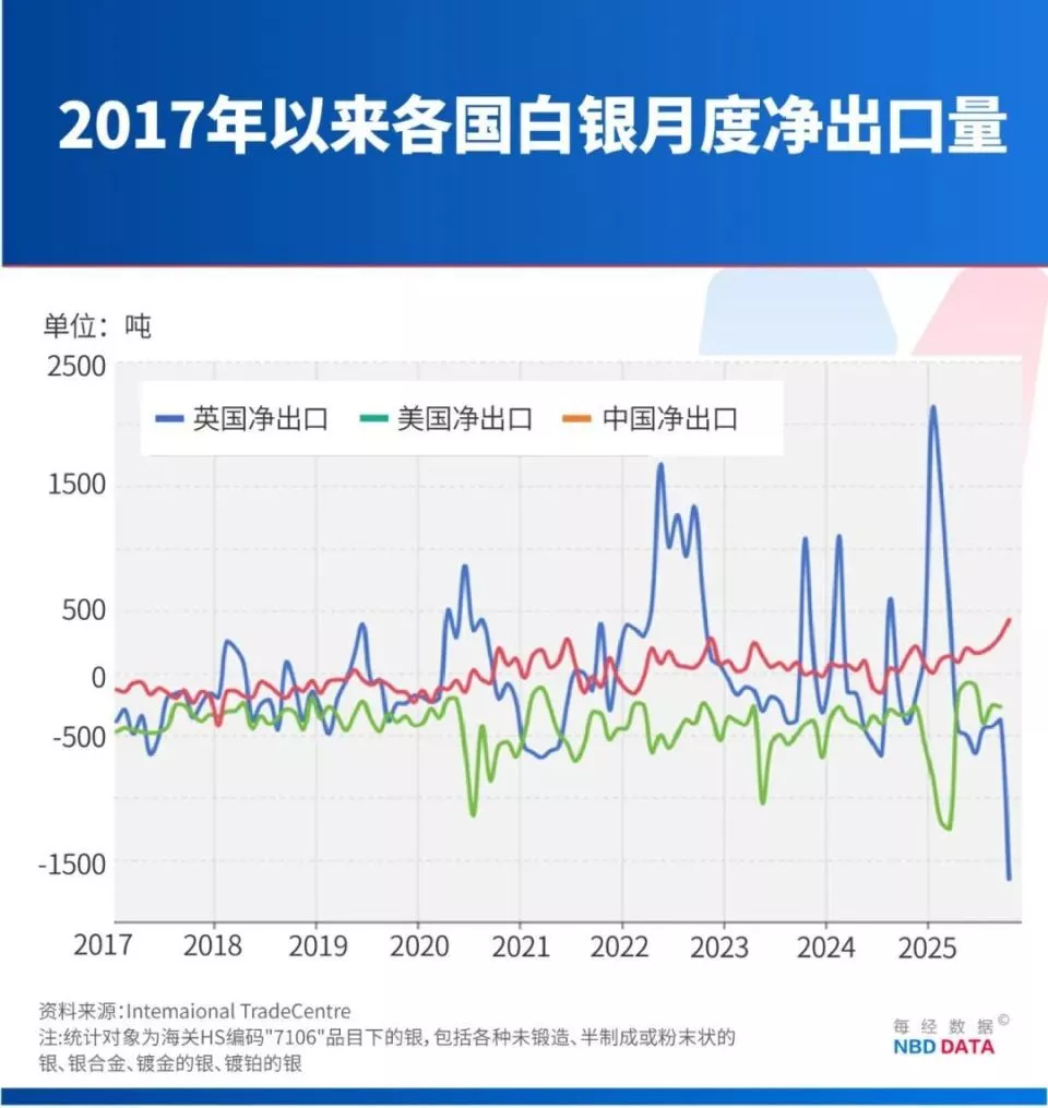 这种跨洋套利,也让英国的白银进出口量出现了180度大转弯:从2025年初的白银超级净出口国变成年底的白银超级净进口国。根据International Trade Centre的数据,2025年1月,英国的白银(海关HS编码“7106”品目下的银,包括各种未锻造、半制成或粉末状的银、银合金、镀金的银、镀铂的银)净出口量超2000吨,而11月的白银净进口量变成1650吨。