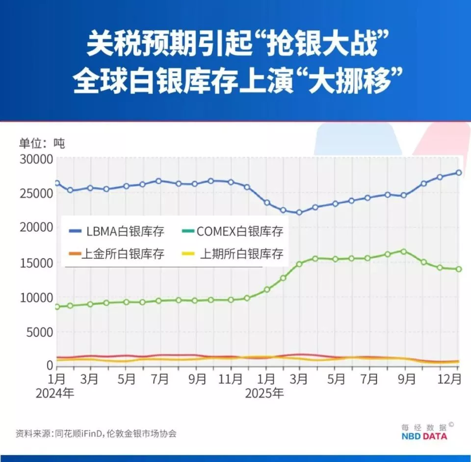 虽然白银价格大多数跟随黄金,但本轮银价大涨的逻辑,要从库存说起。2025年以来,关税预期引起了全球“抢银大战”,其激烈程度,可从区域库存的变化中管中窥豹。
