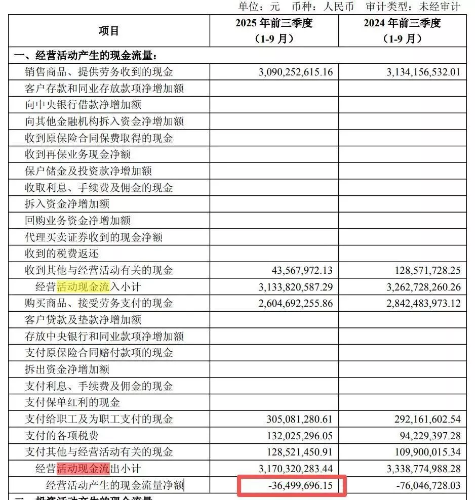 值得注意的是,这场转型发生在公司财务状况并不宽裕的背景下。2025年前三季度公司的经营活动现金流净额负3649万元,未能产生正向的现金流入。
