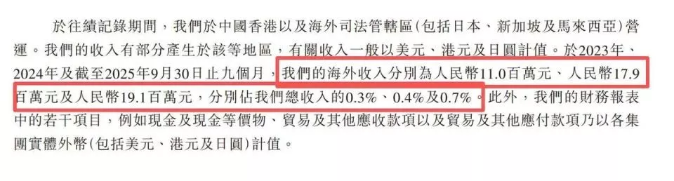 但其国际化战略目前取得的实质进展有限。截至2025年前三季度,公司来自海外市场的营收贡献仅为0.7%。