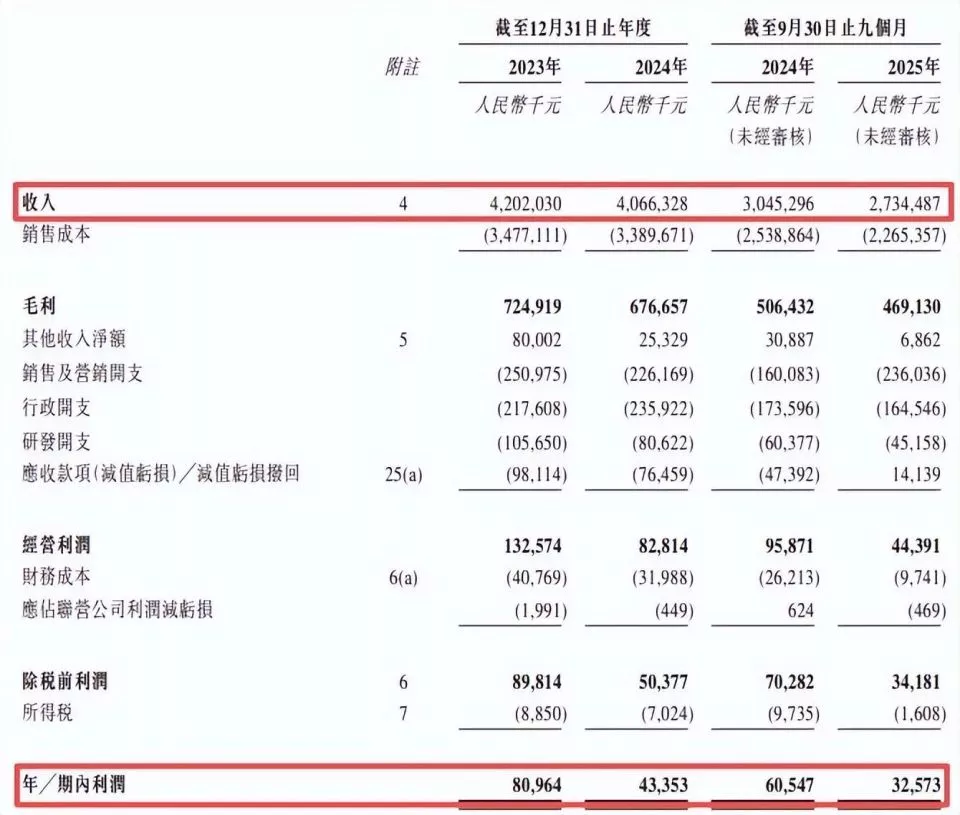 根据港交所文件,2024年公司营收虽维持在40亿量级,但同期净利润较三年前已大幅收缩,仅录得4300余万元。