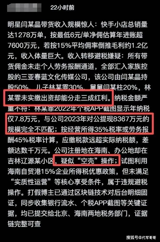 更令人怀疑的是,根据公开的税务数据,2023 年三亚春兰文化传媒公司提现金额高达 8367 万元,这表明公司在这一年有着丰厚的收入。然而,林傲霏在 2022 年缴纳的个税却仅为 7.8 万元。这一收入与纳税金额之间的巨大差距,形成了鲜明的对比,严重不符常理。如此悬殊的差异,让人不禁怀疑,闫学晶及其家人是否存在通过公司转移收入、规避纳税义务的行为。这一发现如同一颗重磅炸弹,再次引发了公众对闫学晶的强烈质疑,也让她陷入了偷税漏税的舆论风暴之中。