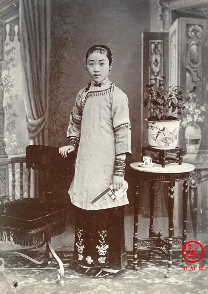 这位年轻女子的衣装和发型都很时尚,体现出晚清的服饰变迁。她的小脚则为她打上了深深的传统烙印。