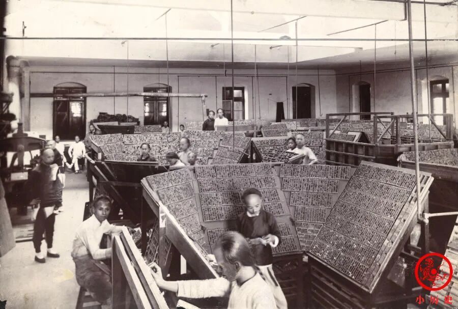 “排字”是传统印刷工艺的一个工种,是对古代活字印刷术的继承与发展,活字的材质不再是泥坯或木块,而是用金属铸造(主要用铅)。照片中工人们正对照书稿,在字架上排字。对排字工人来说,最怕的就是改动内容,排好的字架上有一个字要增删,连带着后面的活字都得移动。