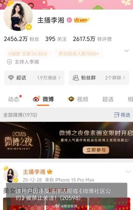 1月16日,极目新闻记者注意到,前湖南卫视主持人李湘的抖音、小红书和微博的账号被禁止关注。 李湘在抖音有421万粉丝,在微博上有2456.2万粉丝,在小红书上有48.7万粉丝。 当日,极目新闻记者联系小红书客服,接线人员表示,会记录相关情况,进行核实处理。抖音平台客服表示,无法查询他人账号被禁止关注的具体原因。微博提示消息显示,“该用户因违反法律法规或《微博社区公约》被禁止关注”。