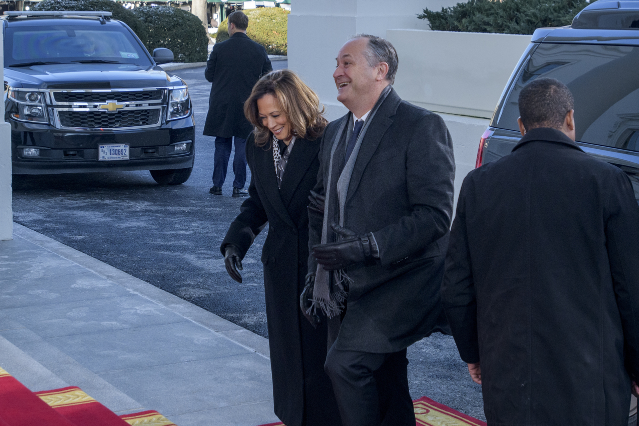 前副总统贺锦丽夫妇,去年在马里布斥资800万买一间豪宅。图为贺锦丽卸任副总统后,与丈夫任德龙离开华府。(美联社)