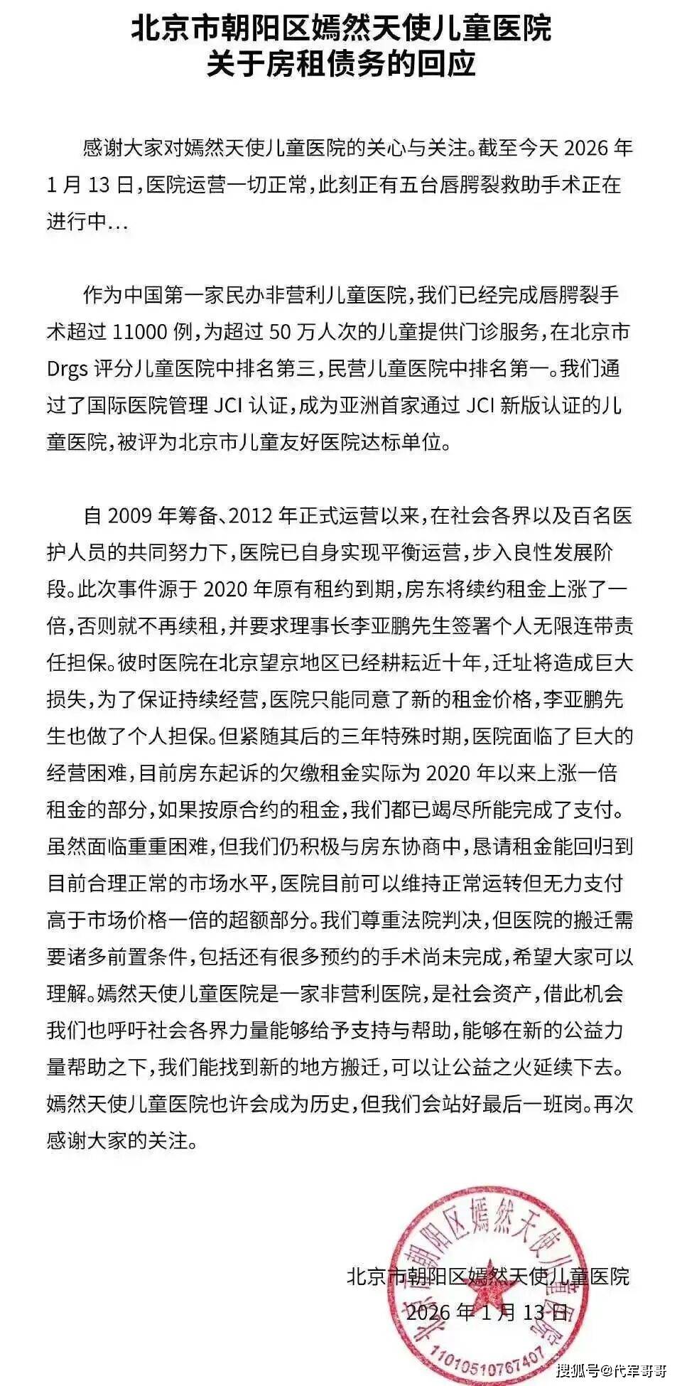 这起纠纷的核心源于一份租房合同的续签争议。据李亚鹏公开披露,嫣然天使医院的租房合同为十年一签,2019年第一期合同到期后,房东提出将年租金从500万元翻倍涨至1100万元。面对这一近乎苛刻的涨幅,李亚鹏耗时半年寻觅替代场地未果,最终被迫妥协,不仅签下新租金合同,还以个人名义出具了法人担保。