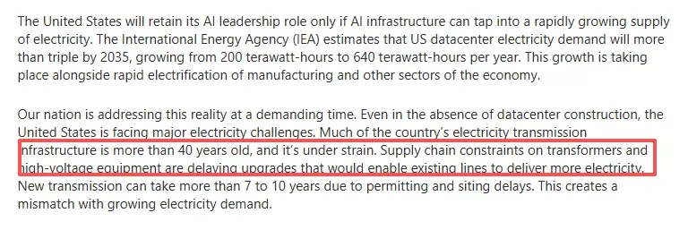 微软在报告中承认:美国大部分输电线路运行超过40年,早就超负荷运行,变压器等关键设备全球缺货,供应链被卡得死死的。
