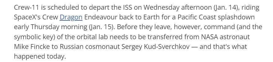Crew-11任务4人乘组返回前,这个乘组的航天员迈克·芬克就是国际空间站的指挥官,这下他返回了,很多人都以为这个控制权会给另一个乘组的美国航天员,但结果并不是这样,因为象征空间站控制权的钥匙交,已经在返回前交到了俄罗斯宇航员谢尔盖·库德-斯韦尔奇科夫手上。