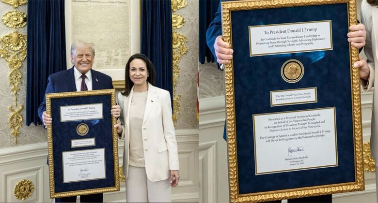 委内瑞拉反对派领导人和诺奖得主马查多说 :“我向美国总统转赠诺贝尔和平奖章,表彰他对我们自由的贡献。”
