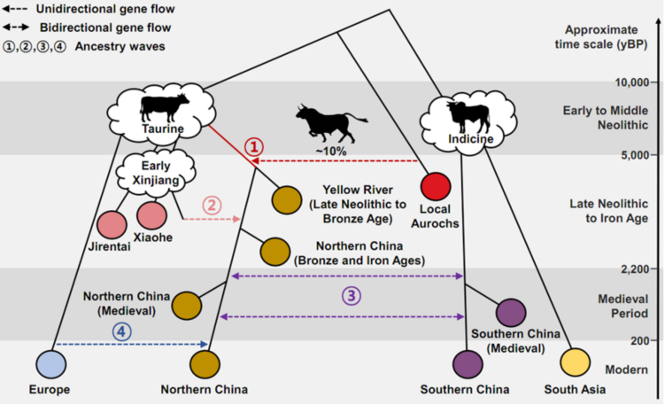 具体而言,他们观测到了四次关键融合事件,分别是:东亚本土原牛向早期家牛的基因渗入、青铜时代晚期新疆相关祖源成分的东向输入、中国南方瘤牛与北方家牛的融合以及欧洲黄牛成分的输入。
