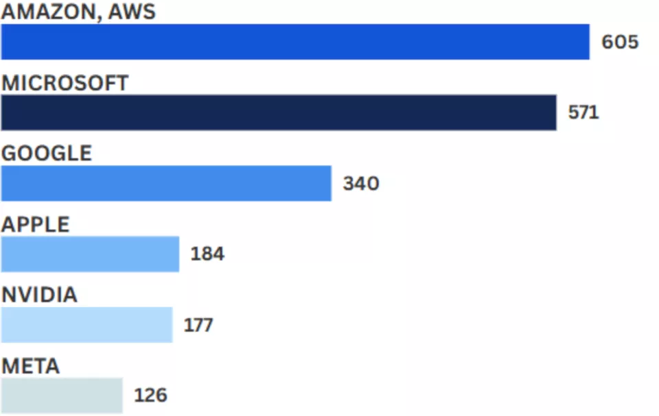 亚马逊(包括云计算部门AWS)势头最猛,相关招聘已达605人。