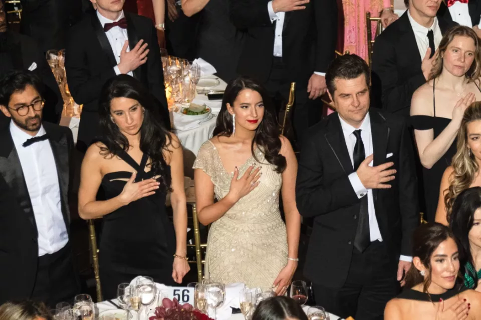阿什利·圣克莱尔站在马特·盖茨旁边,出席2024年在纽约举行的一场政治活动。 劳拉·布雷特/ZUMA PRESS