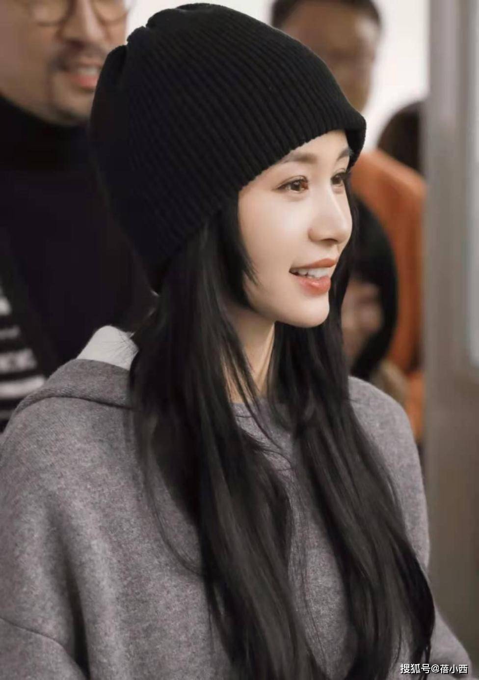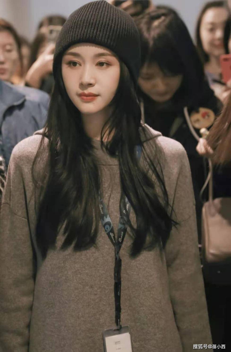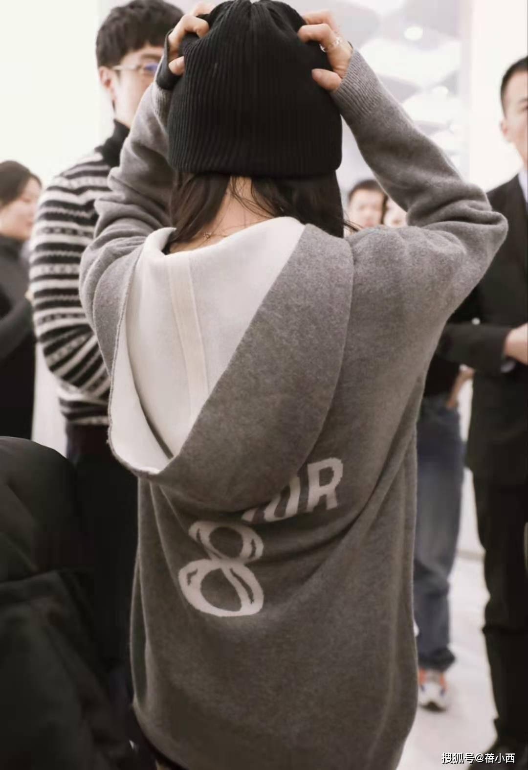通过观察,上半身极有可能穿了三件。领口、衣摆处都能看到白色面料。灰色卫衣夹在中间,就是无法看出里层是否加绒。灰色卫衣依旧具有百搭特点,短款设计最为流行,毕竟人人都想拥有大长腿。腿上裤子依旧是灰色面料,大腿处松量看着挺多,那么大腿根就算有肉肉,也不会被看到。