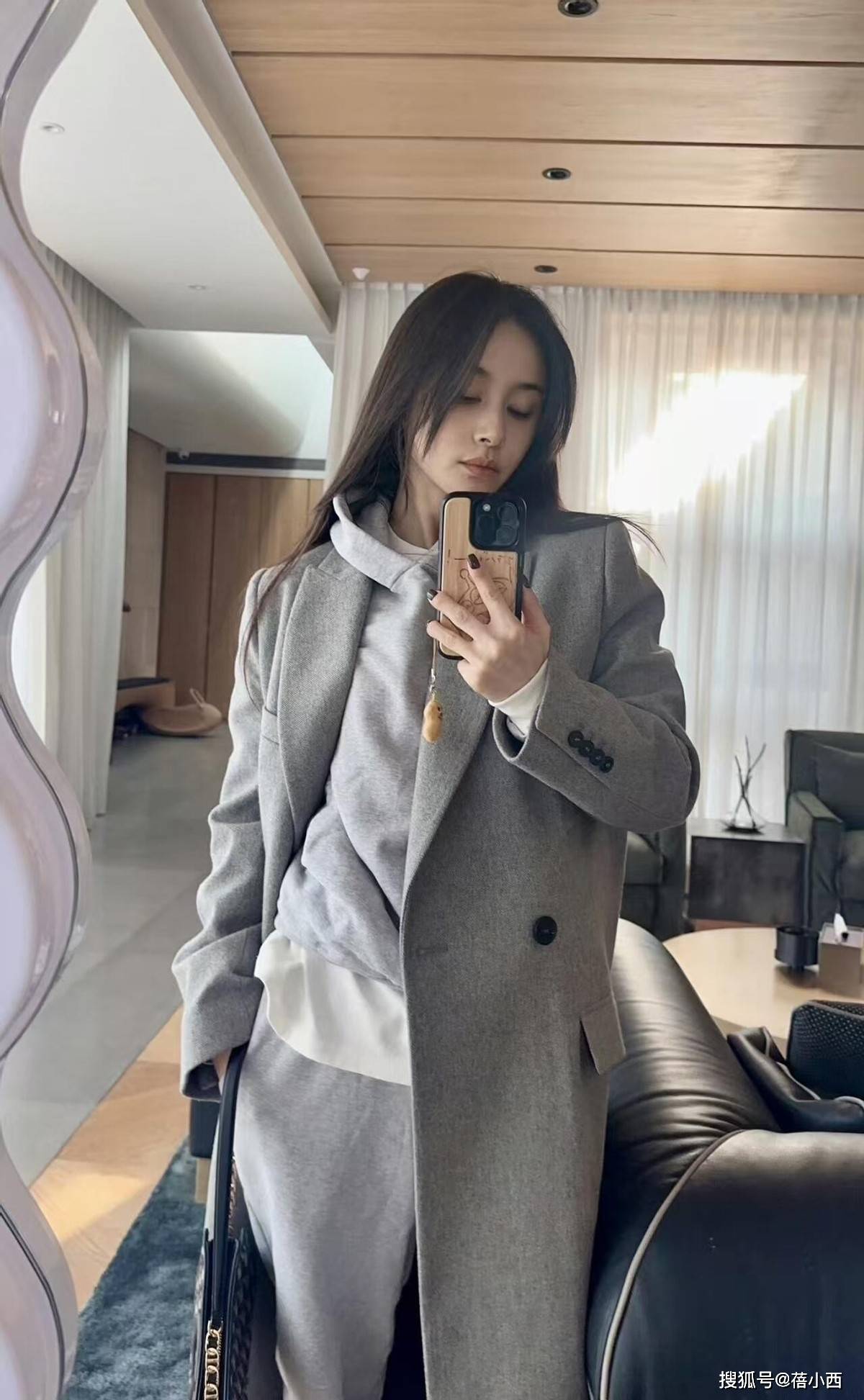 灰色大衣的吸引力远超想象,很少有人选亮色大衣,除了高调外,对穿着者的要求也会高些。不管你皮肤颜色如何,都能hold住灰色大衣。身上这件灰大衣从面料上看,是春秋款,今年二月初就要立春了,到时等温度回升些,大家便可试试王子文身上这款大衣。只是有一问题,这件大衣看上去应该是中长款,如果小个子女生想穿,脚上估计少不了高跟鞋。