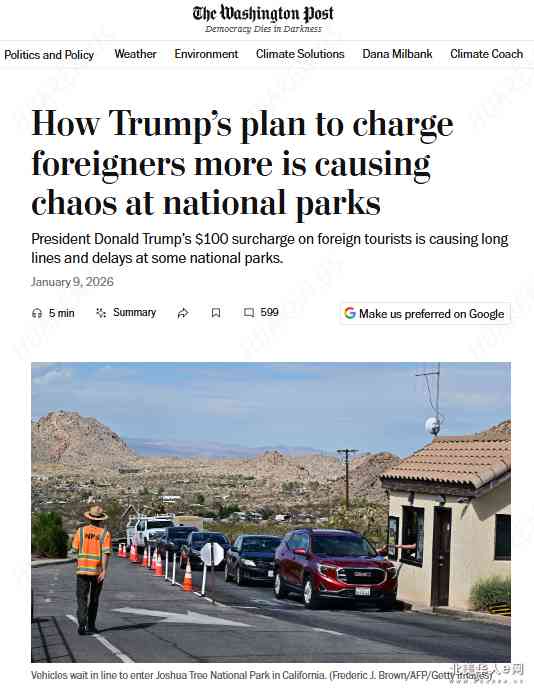 川普总统对外国游客征收100元附加费的政策,导致热门的国家公园入口大排长龙,甚至当场掉头离去。游客一到国家公园入口处就会被问,「你是美国居民吗?」