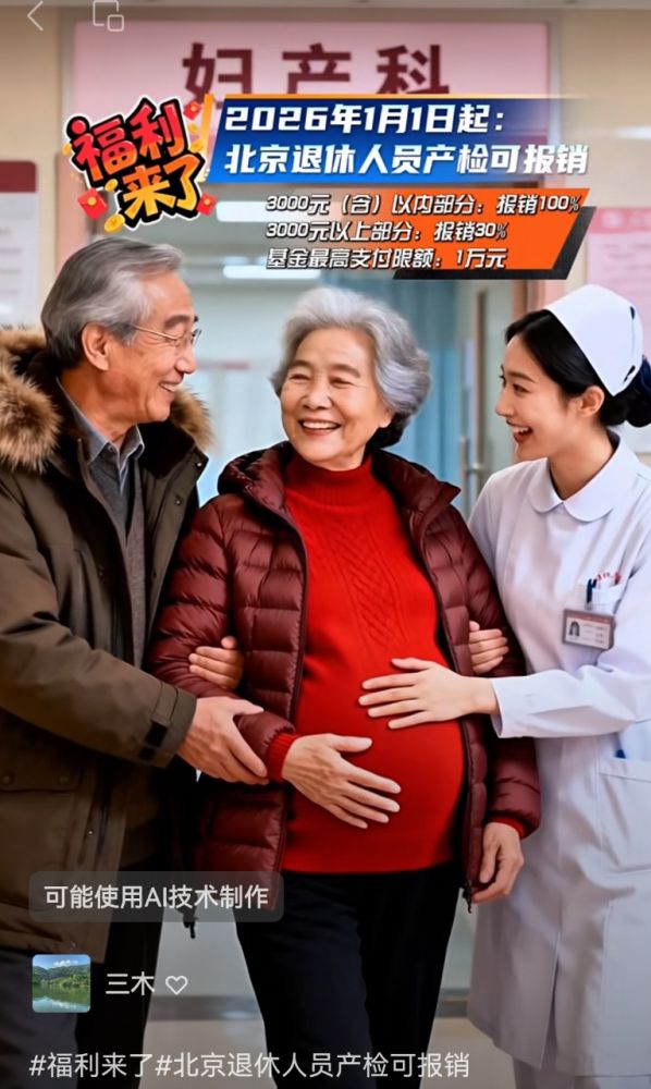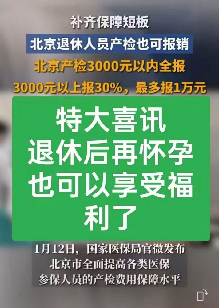2026 年开年第一个民生大瓜,被北京医保新规摘下了。北京明确规定,自2026年1月1号起,退休人员纳入产检费用报销范围,3000 元以内全额报、超 3000 元按 30% 比例报,年度封顶 1 万元,和在职女职工享受一模一样的待遇。网上一片笑声,爆梗连连——