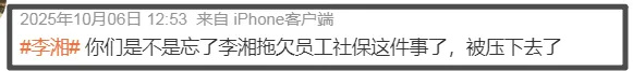 至于离得较近的争议则是两件,一件是跟释永信有牵扯,多年旧照被指两人有情感和商业勾结,网友质疑李湘或参与帮忙洗钱。另一件则是不给员工交社保,早前有网友扒出王岳伦旗下有带“诗龄”的公司,注册资本千万,但从2019年成立后参保人数显示为0,意味着公司从未给员工缴纳过社保,与李湘一家奢侈的生活形成了强烈对比,舆论发酵后,王岳伦注销了公司。