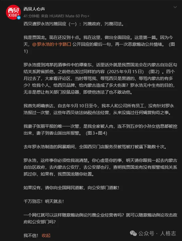 最弱智的做法是,今晚贾国龙决定拉罗永浩去政府和公安部门对责,查查他有没有报警,没报的话,就是“随意煽动舆论攻击政府和公安部门”。