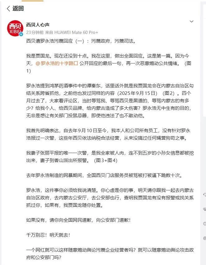 贾国龙表示,罗永浩在公开回应中恶意煽动公共情绪,无端指责其会勾结内蒙古自治区政府和公安部门抓人,这与2025年9月15日罗永浩的类似言论如出一辙。