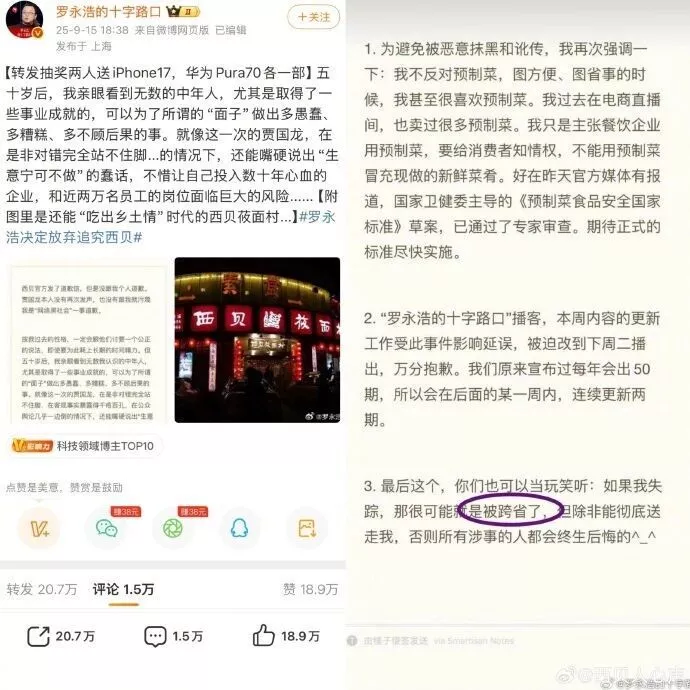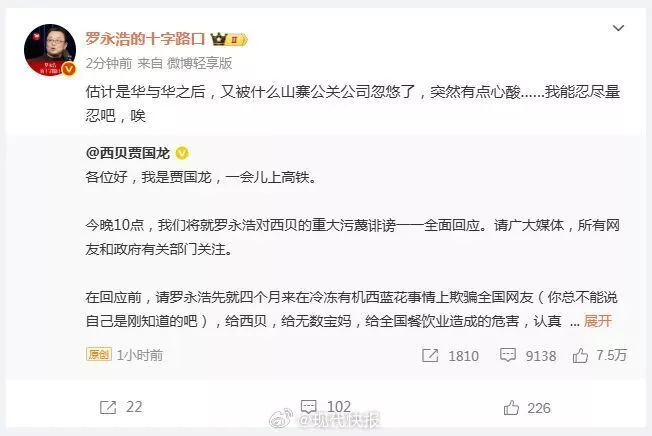 1月16日,西贝贾国龙发文预告:今晚10点,将全面回应罗永浩对西贝的相关言论。随后,@罗永浩的十字路口转发并表示:“估计是华与华之后,又被什么山寨公关公司忽悠了,突然有点心酸……我能忍尽量忍吧,唉”。