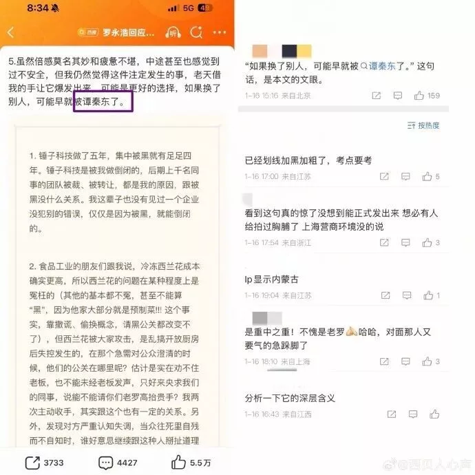 1月16日,西贝餐饮创始人贾国龙通过社交媒体回应罗永浩。