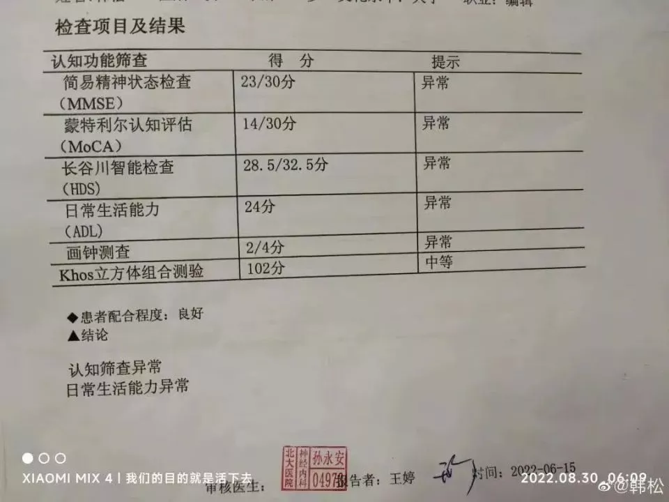 2022年9月,韩松在微博宣布,自己确诊了认知症,「认知异常」、「日常生活异常」。用通俗的话讲,就是「老年痴呆」。