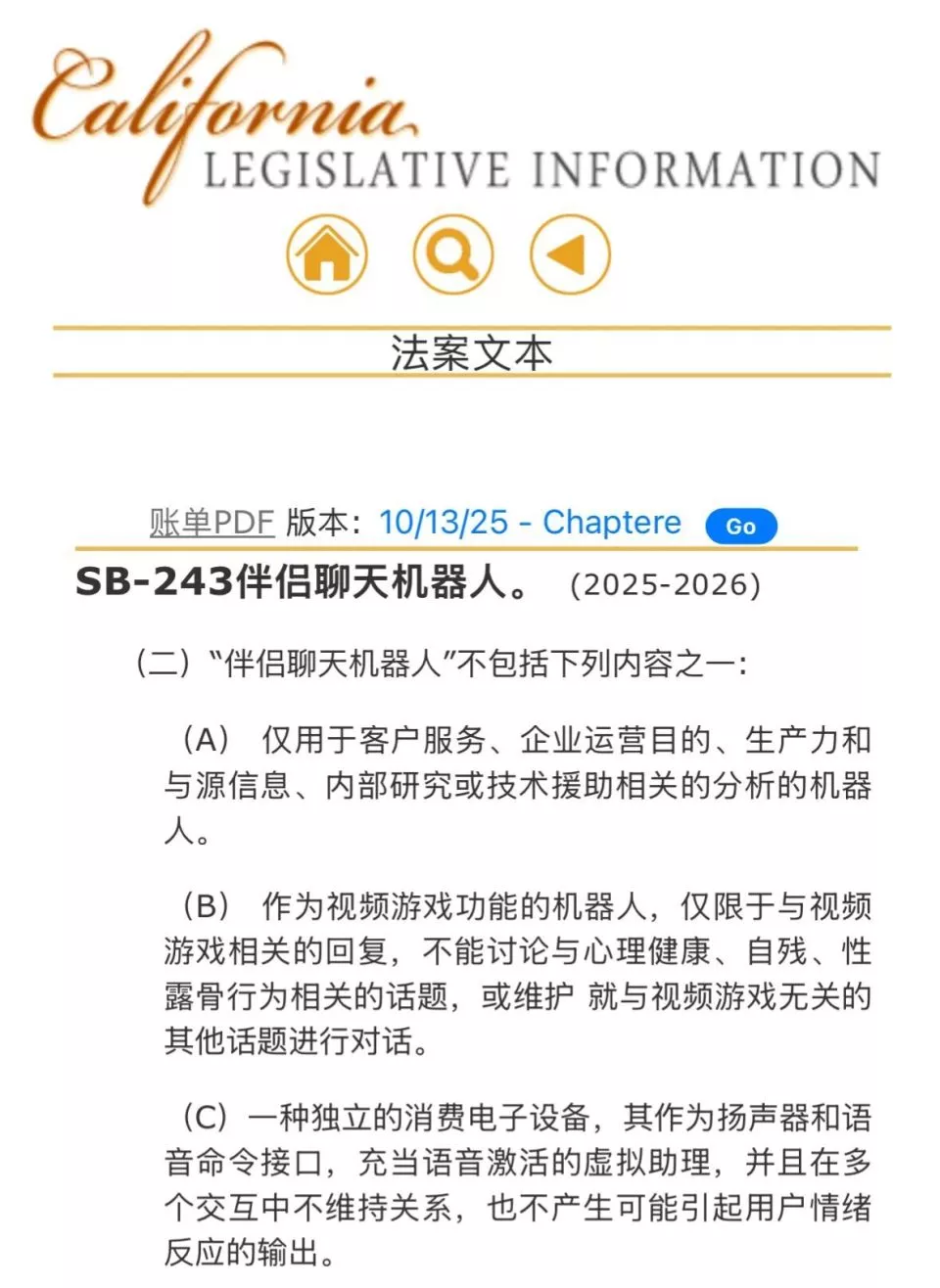 2025年10月,美国加州州长率先签署“参议院第243号法案”(SB 243),宣布将对AI陪伴型聊天机器人进行监管。