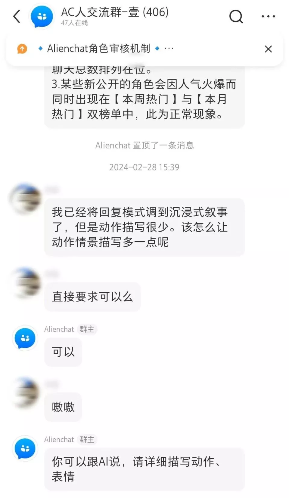 一个名叫AC人交流群-壹的群聊界面显示,群内名为AlienChat的群主告诉玩家可以直接跟AI要求详细描写动作和表情