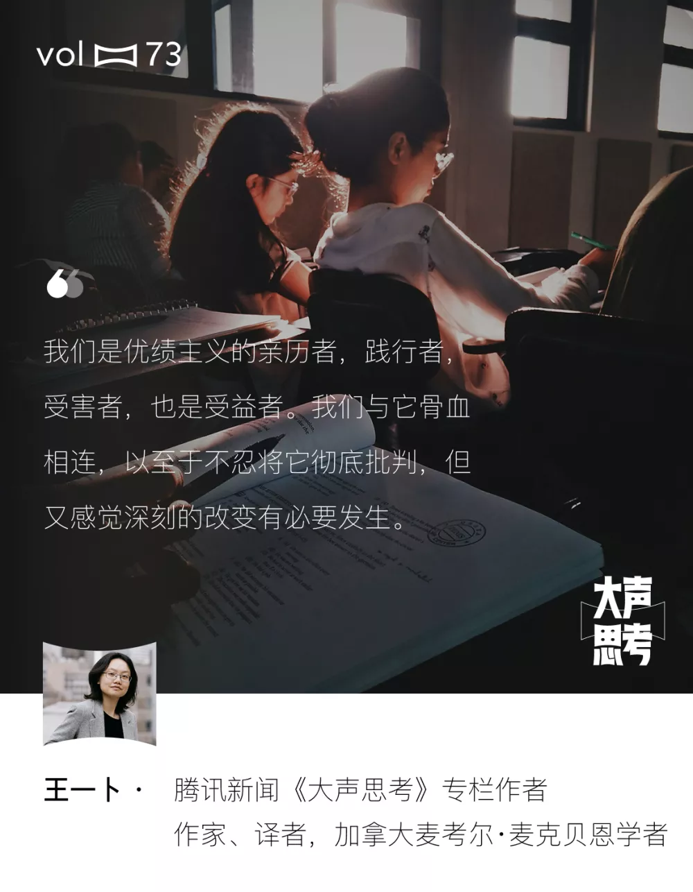 优绩主义善于制造这种天真的残忍。那些不服气的同学是没有同理心的坏小孩吗?我不觉得这么简单。如果他们这样看待同伴的疼痛,那很可能也不懂该怎么怜惜自己的痛。未来某一天,痛累积到受不了,该怎么办?这样的病变是器质性的,还是在某种境况里,人们有办法修复自己被损坏的感觉神经?我不确定自己能否代表这样一群中国年轻人:过去的十年、二十年里,我们是优绩主义的亲历者,践行者,受害者,也是受益者。我们与它如此骨血相连,以至于不忍将它彻底批判,但又切实感觉到某种不对劲,感觉深刻的改变有必要发生。