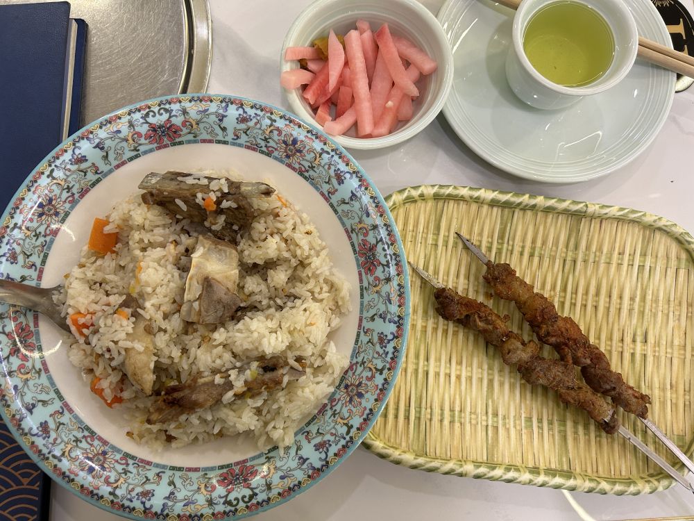 到清真餐厅就要吃羊肉,我知道的最有名的就是羊肉手抓饭,点了一份手抓饭外加羊肉串。手抓饭里的羊肉没有任何膻味,挺好吃的。饭里的油比较多,要靠吃酸萝卜解腻,一份差点没吃完: