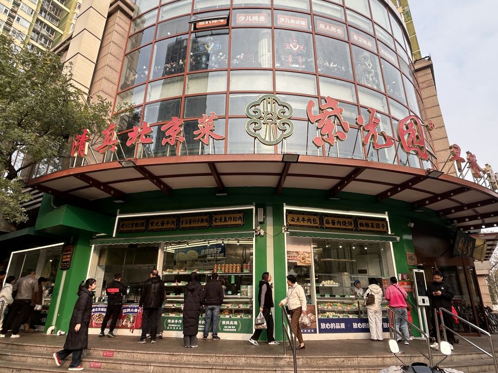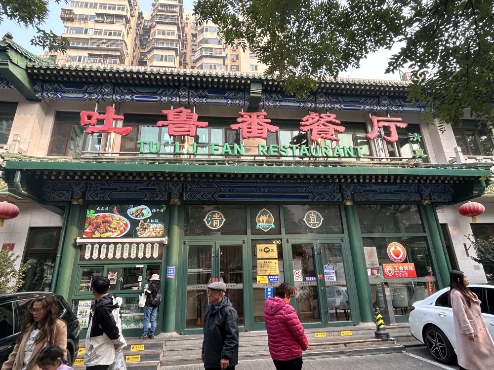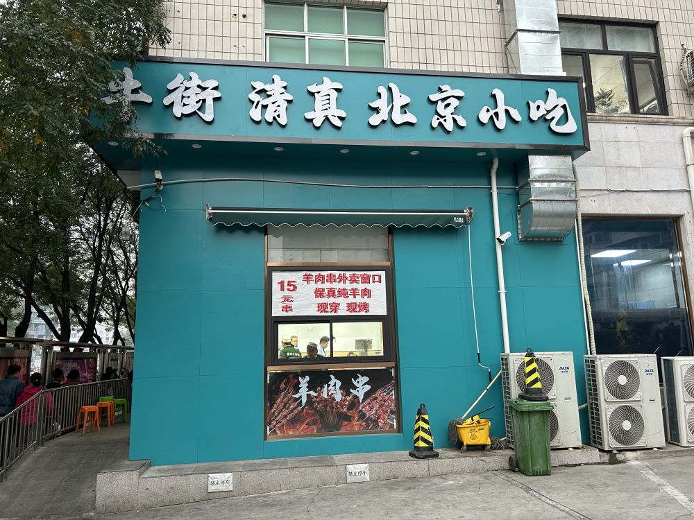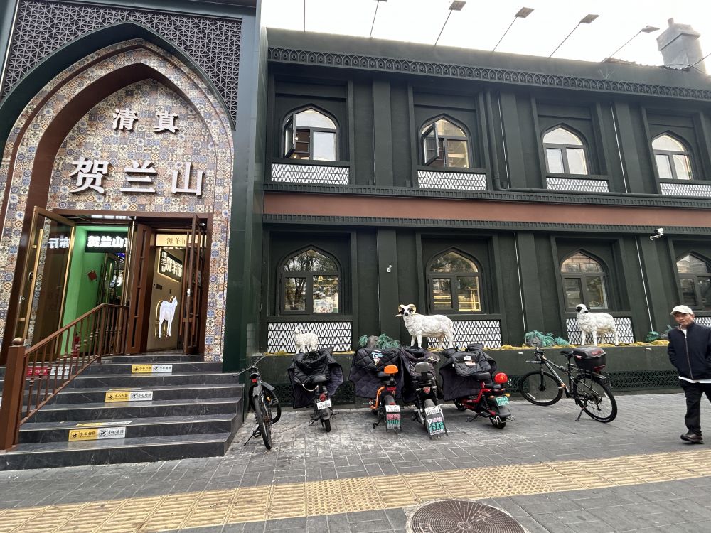 中午在牛街找个地方吃清真饭,这家叫贺兰山的餐厅很有清真风格,门口还有几只小羊的雕像,就选它了: