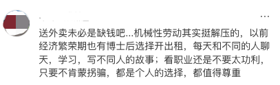 还有网友反驳称:“送外卖不一定是缺钱,可能是因为机械性劳动比较解压,每个人的选择都不一样。”