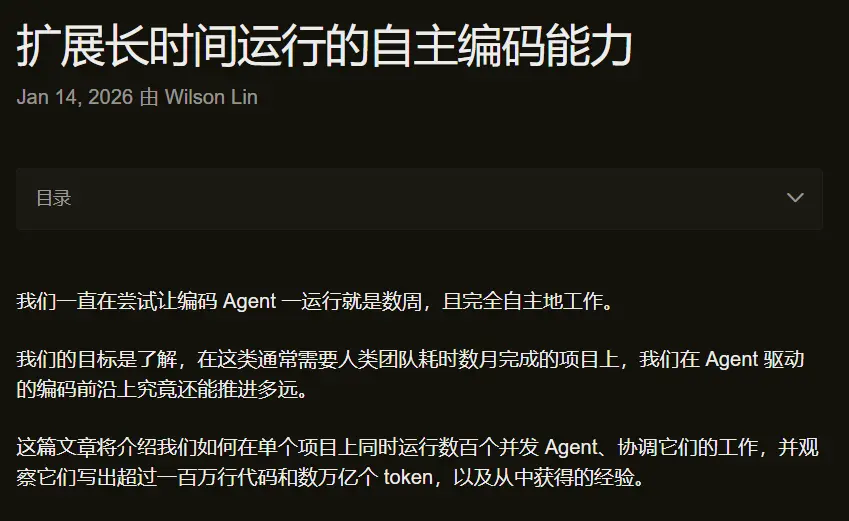 在1月14日,他们发布了一篇题为「Scaling long-running autonomous coding」的博文。