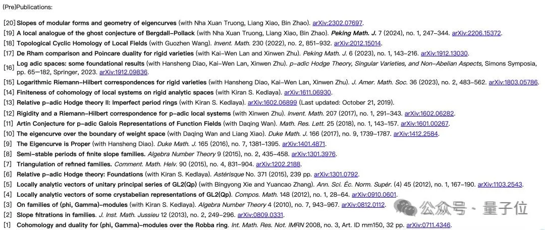 据北大数院官网介绍,他的工作对p进霍奇理论有基础性贡献,建立了相对p进霍奇理论的基础理论,特别是对非交换p进霍奇理论做出了一系列开创性工作,解决了p进自守形式领域数个多年悬而未决的猜想,提出了拓扑循环同调全新的计算方法。