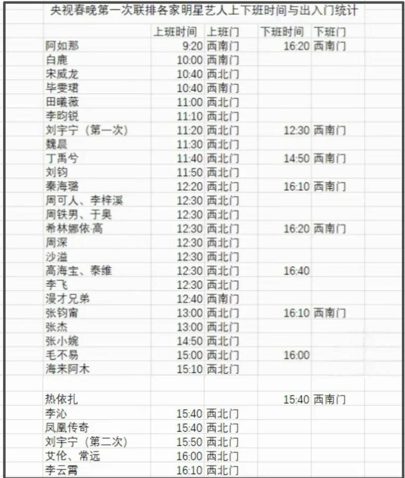 有网友整理了一份春晚联排上下班名单(持续更新版),发现绝大多数明星都在下午一点之前现身,其中有两位情况特殊,他们对待场外蹲守人员的态度也形成了鲜明对比。