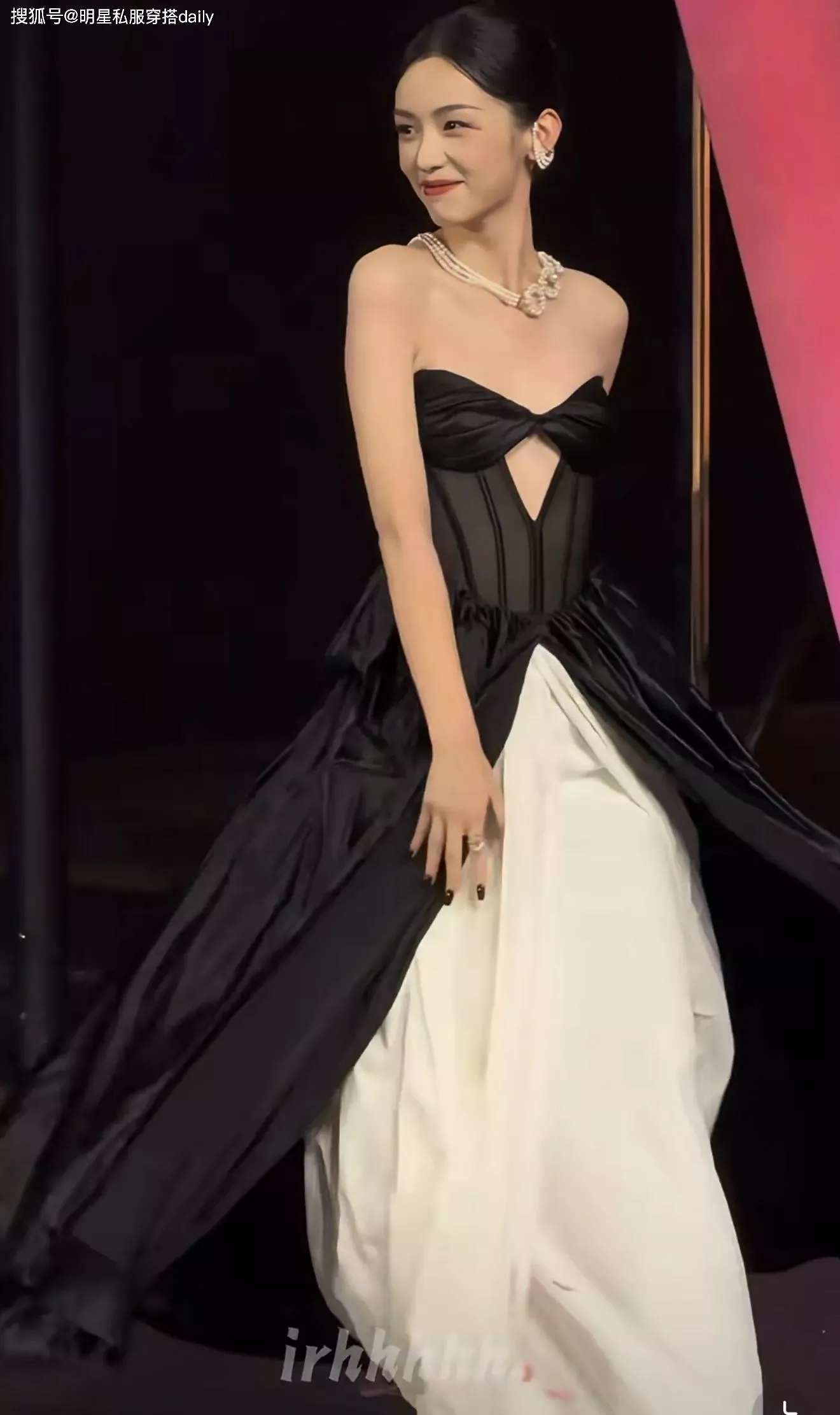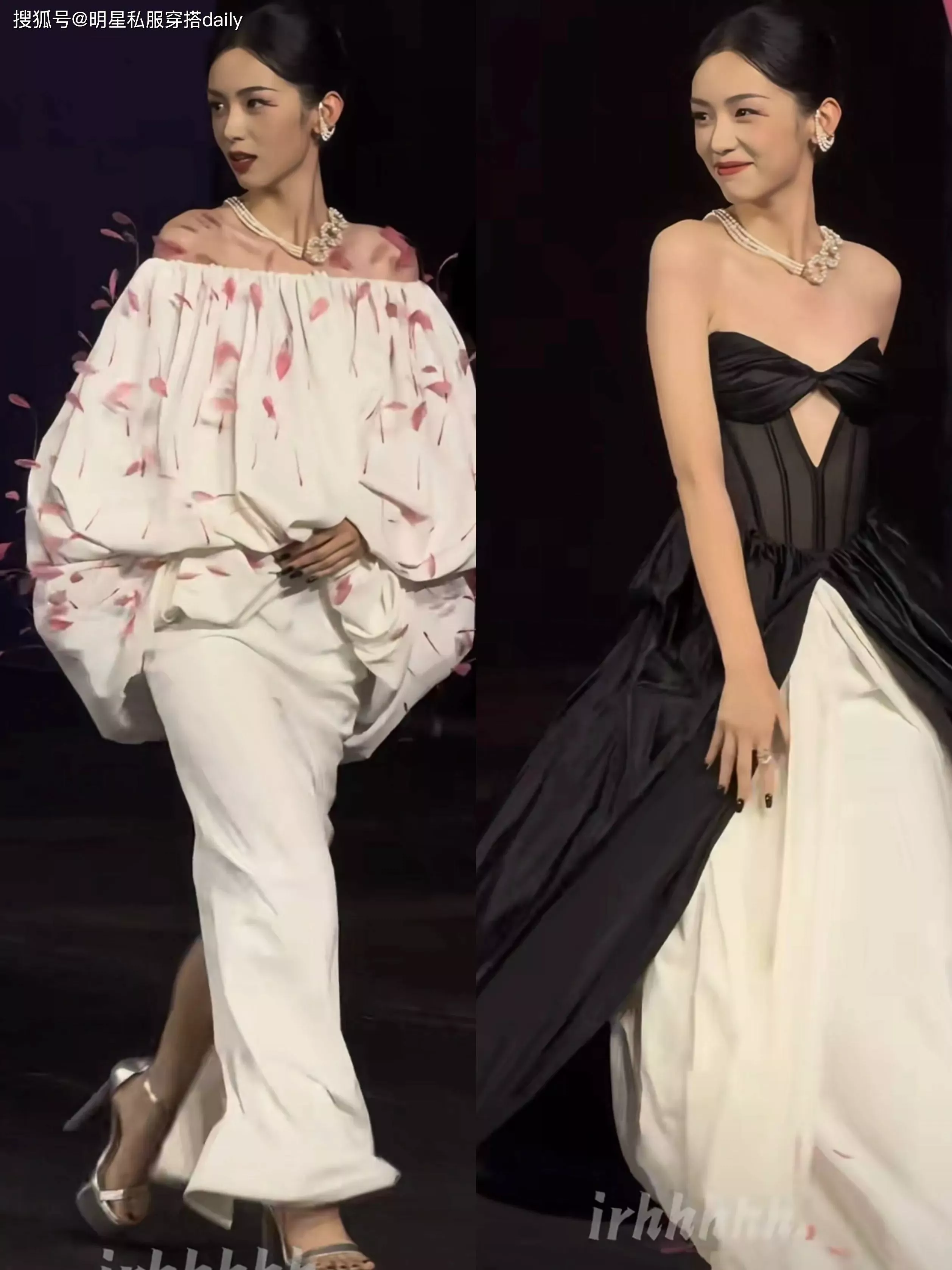 而在走秀时,她把上半身的一字肩设计解开后,则变成黑色蝴蝶结抹胸拼接礼服裙!黑白撞色设计,凸显她的优越的事业线!明艳又性感!