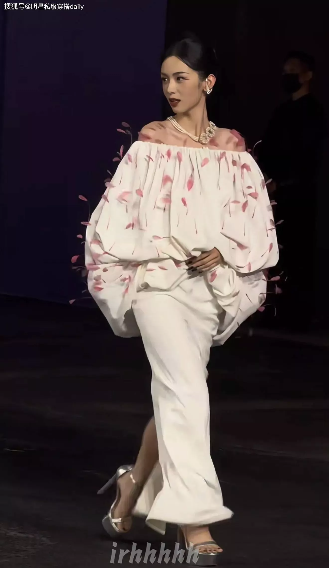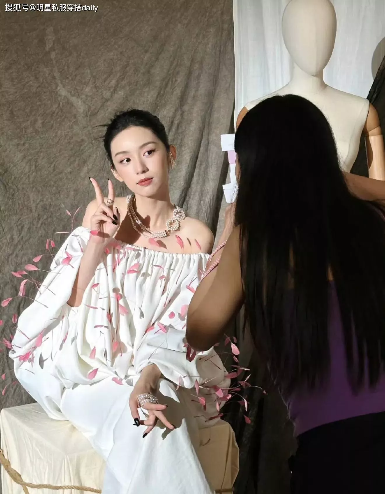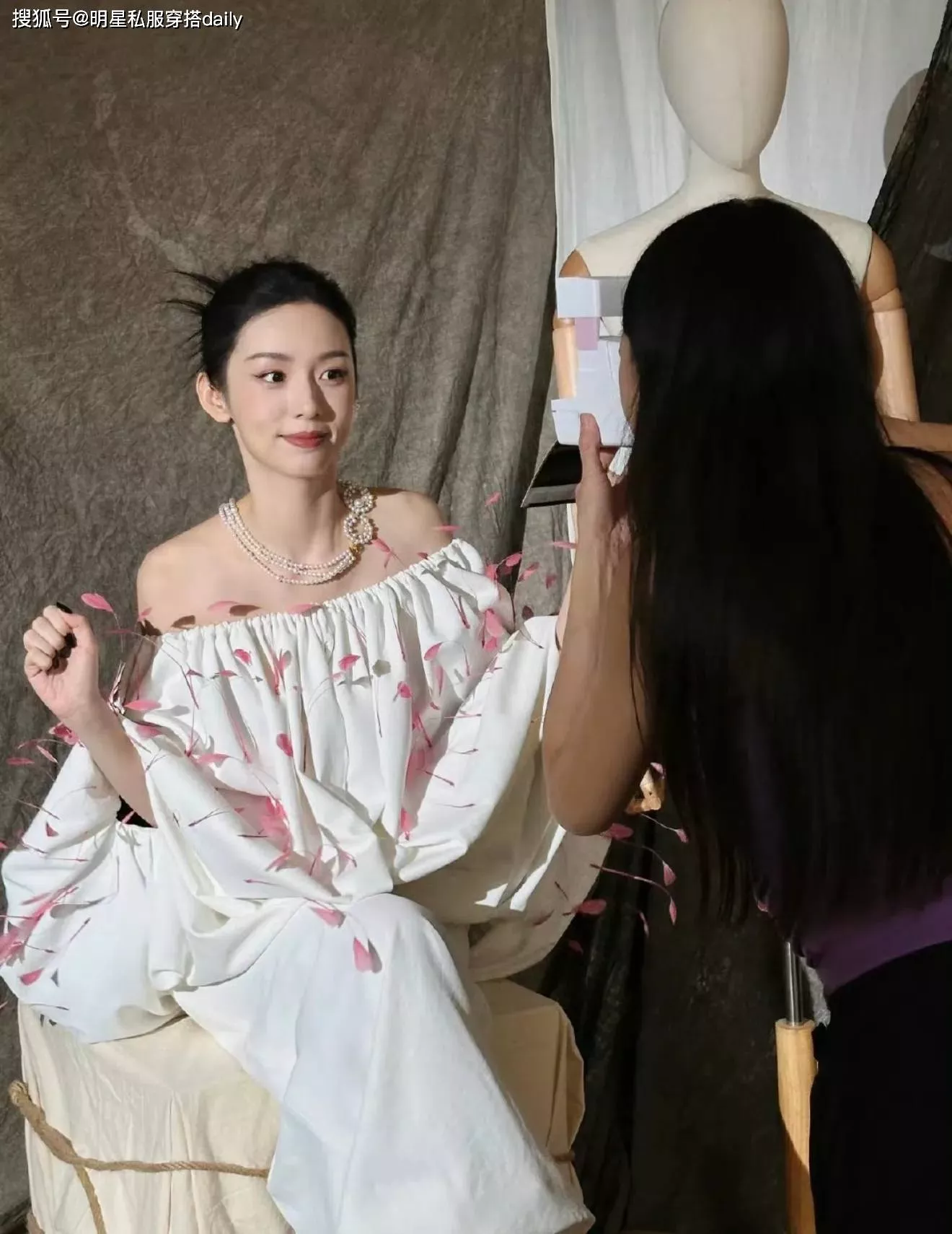 周也得姐姐周绮思为她设计的这款裙装,可以说把甜美和性感融为了一体!白色一字肩抹胸裙,上面点缀着粉色立体花瓣装饰,搭配珍珠串珠项链,温柔端庄,又散发着甜美气息!