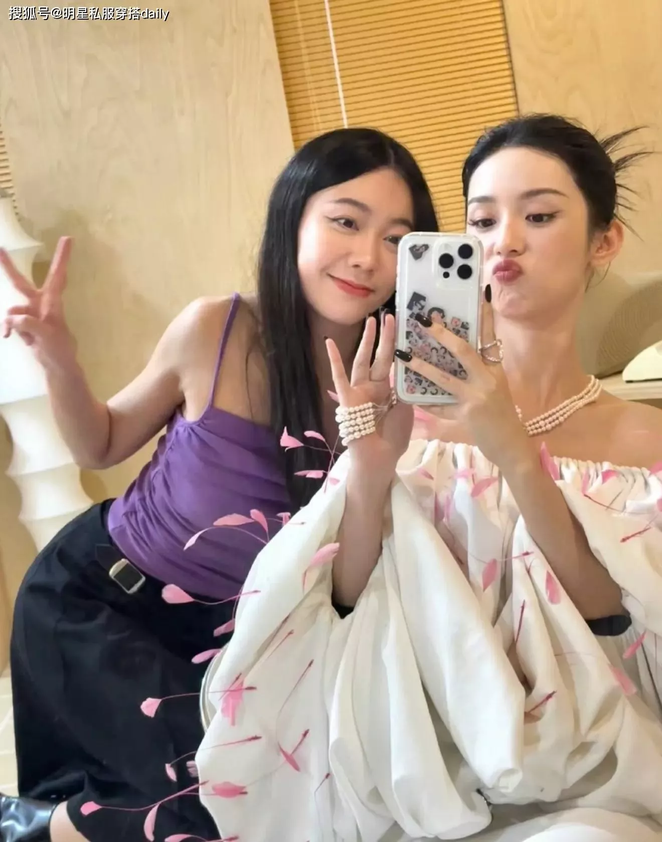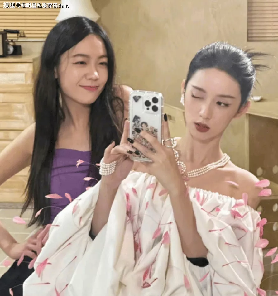 其实姐姐的颜值也很高,穿着紫色吊带上衣,也是性感又洋气!姐妹两人一起对着手机拍照,尽显姐妹情深!