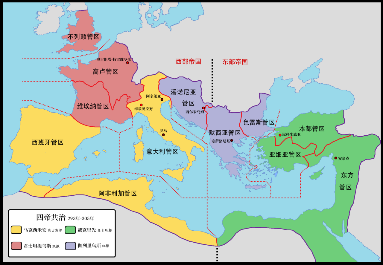 黄:西帝国奥古斯都马克西米安 绿:东帝国奥古斯都戴克里先