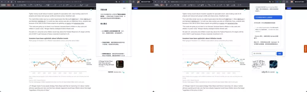 *左图:我做的浏览器插件可以对当前网页的内容做结构化的总结;右图:插件还支持用户跟AI就网页内容做进一步的讨论和问答