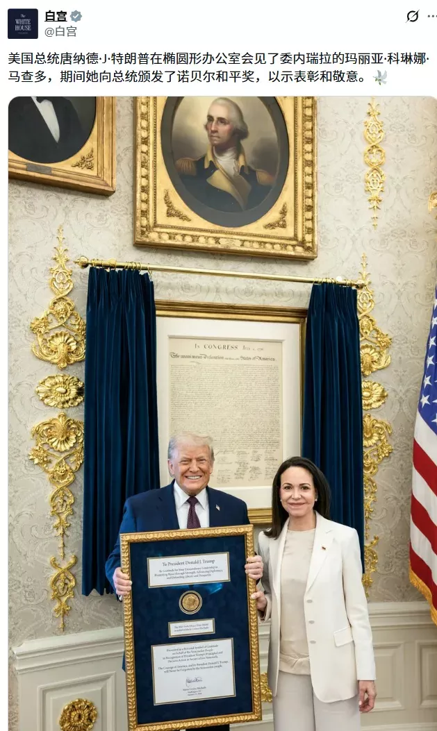 2025年诺贝尔和平奖获得者,委内瑞拉反对派代表人物马查多到访白宫,一碰面就看门见山的为特朗普奉上这份“殊荣”