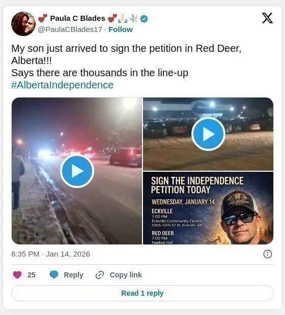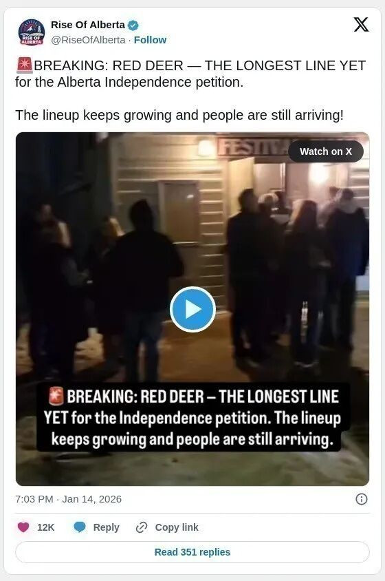 即使地上有冰雪以及夜晚的寒冷,似乎也无法阻止大批人群周三晚上在阿尔伯塔中部两座拥挤的社区大厅外排队,他们不少人想签署推动阿省脱离加国的公投的请愿书。