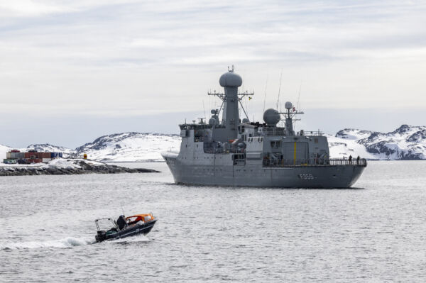 美国总统川普提出接管格陵兰之际,共和党议员提出法案,支持该北极岛成为美国第51个州。图为2025年5月4日,一艘丹麦海军船只准备停靠格陵兰首都努克市。