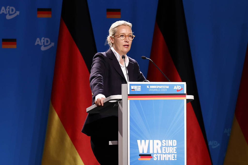 资料图:2024年,魏德尔在德国选择党党代会上发表讲话。视觉中国