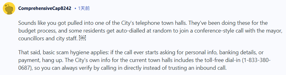 “听起来你好像被拉进了市政府的电话市政厅会议。他们为了预算编制举办这种会议,随机自动拨打给部分居民,邀请他们加入到市长、市议员和市政工作人员的电话会议中。话虽如此,基本的防诈骗措施仍然适用:如果来电开始索要个人信息、银行账户信息或要求付款,请立即挂断。市政府公布的最新市政厅会议信息中包含免费拨入电话 (1-833-380-0687),建议您直接拨打该号码核实,切勿轻信来电。”