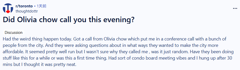 周四(1月15日)晚上,一位网友在reddit论坛的r/toronto版块发帖求证:“今晚邹至蕙给你打电话了吗?”
