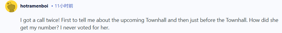 “我接到了两次电话!第一次是通知我即将召开的市政厅会议,第二次就是会议召开前。她是怎么拿到我的电话号码的?我从来没投过她的票。”