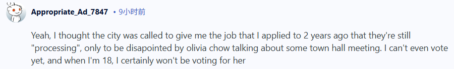 “我还以为市政府终于要联系我两年前申请的那份工作了,结果只是告诉我要开个市政厅会议。我连投票资格都没有,等我18岁了肯定也不会投她的票。”