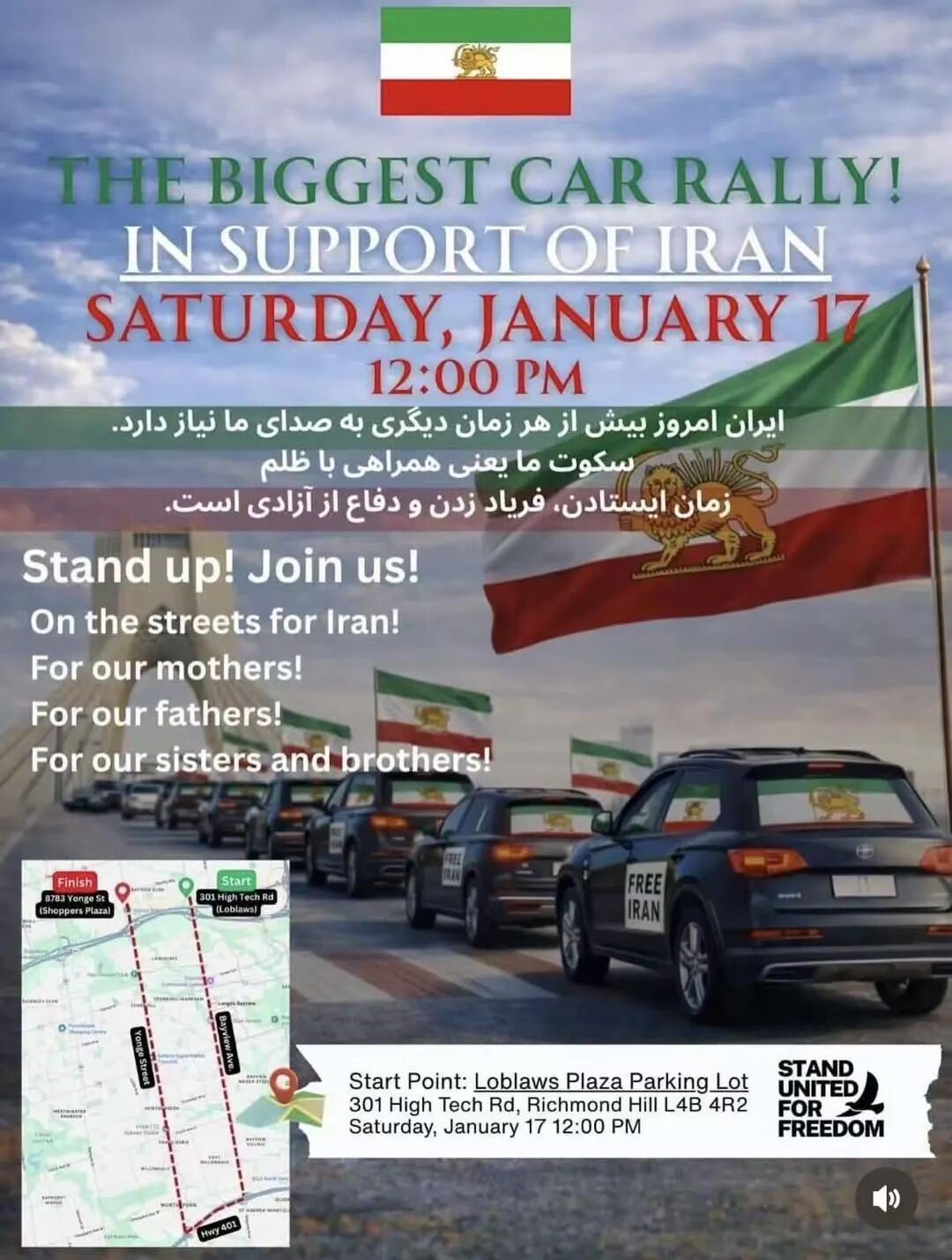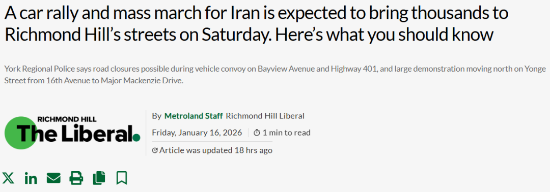 本周六(1月17日)下午,列治文山(Richmond Hill)华人聚居区将爆发来一场声援伊朗的大规模车队游行和千人示威活动,对周边道路通行造成影响。